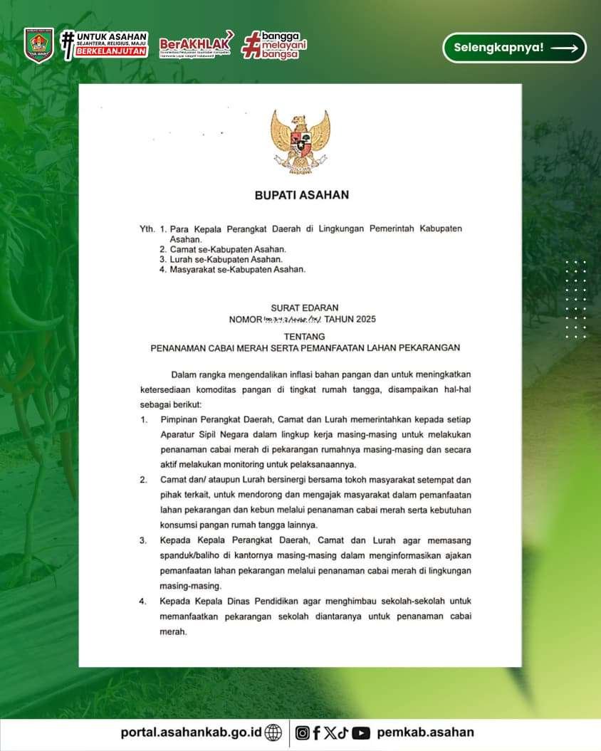 Bupati Asahan Taufik Zainal Abidin, S.Sos., M.Si, menerbitkan Surat Edaran tentang penanaman cabai merah serta pemanfaatan lahan pekarangan. Edaran ini menjadi langkah strategis dalam mengendalikan inflasi bahan pangan sekaligus mendorong kemandirian pangan rumah tangga di Kabupaten Asahan.