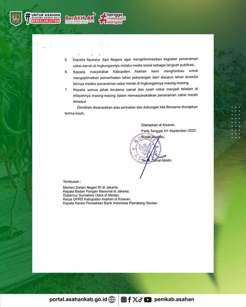 Bupati Asahan Taufik Zainal Abidin, S.Sos., M.Si, menerbitkan Surat Edaran tentang penanaman cabai merah serta pemanfaatan lahan pekarangan. Edaran ini menjadi langkah strategis dalam mengendalikan inflasi bahan pangan sekaligus mendorong kemandirian pangan rumah tangga di Kabupaten Asahan.
